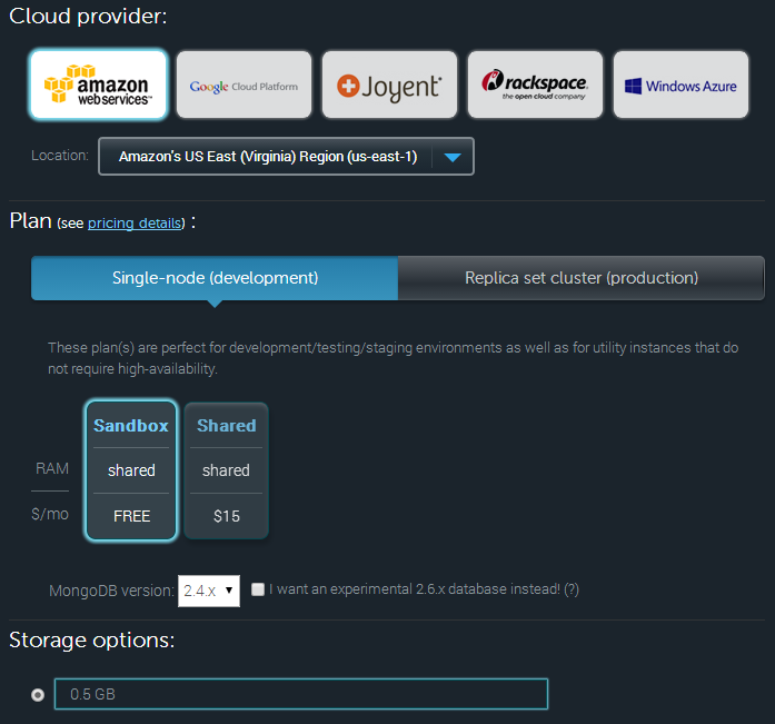 When creating the new database, you can choose the version of MongoDB to deploy, but also get an option for ‘experimental’ which allows you to use the latest and greatest version of MongoDB. This version of MongoDB may not be stable, but this option is useful if you plan on building something for an upcoming stable release of MongoDB, or if you require features that are only available in the latest version.