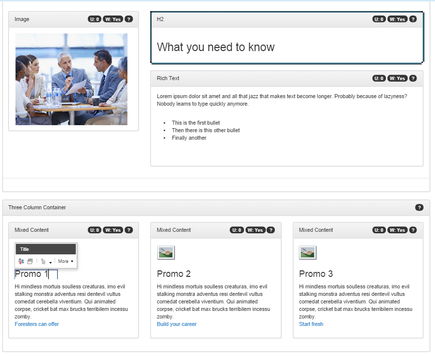 With the Keystone wireframes in place, you now have to validate a few things on the authoring side. While the variety of components available can be used to mock up the design, the components used may not reflect the desired authoring flow. Here are a few things to review with the team:
