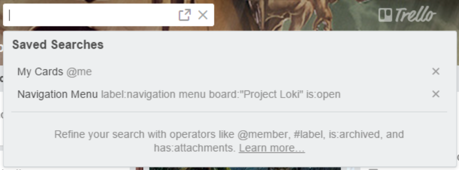 For a Scrum board, once the sprint is over you’ll probably be archiving all the Done stories and tasks, which means you can’t visually see them anymore on the current board. Using the advanced filtering that is available in search (@name, #label, is:archived, description:, etc.) and the Saved Searches you can create reports to quickly find what you need on the board that is important for you right now, or for checking on historical cards. Searches alone are powerful for Scrum, saving them makes it invaluable. Thumbs Up right here.