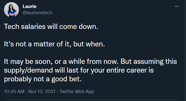 When an entire part of an industry starts cutting jobs, the influx of talent is too great. Supply exceeds demand, salaries start to lower. Before the dot com bubble burst, I was getting offers for huge salaries in SF when I had not even graduated yet. I stayed in school… 🤦🏻♂️