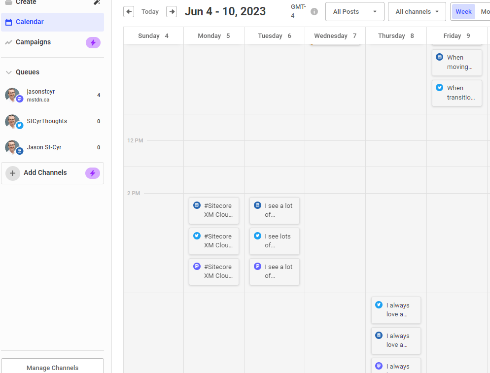 - 3 channels for professional social posts ➡️ Twitter, LinkedIn, Mastodon