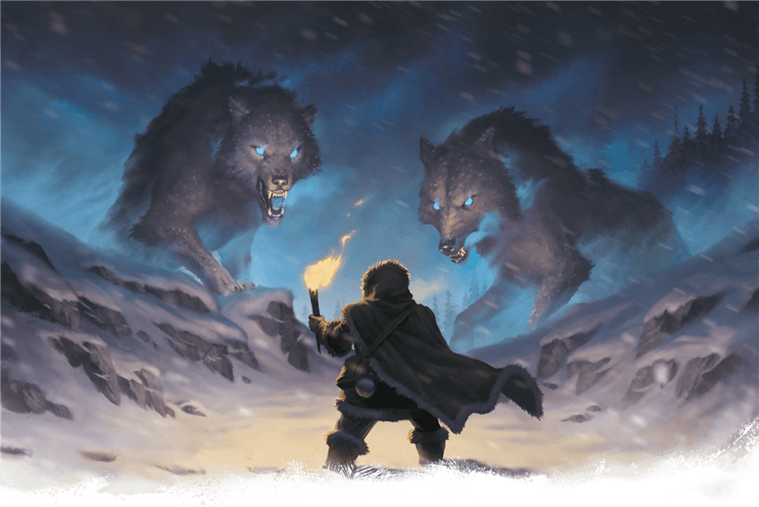 As Audak looked around in stunned disbelief, the howls of many approaching beasts filled the air. Snow lay all around him on what looked to be a trading trail. The spot looked familiar, something close to home in the Spine Mountains. A campfire burned to his left, surrounded by what looked like sleeping bags of a group of travellers, though the travellers themselves were nowhere to be seen. The only other person here was Brylla, his cleric friend, whose eyes were filled with terror. Audak himself was feeling a strong emotion overtaking him, but it was one of anger, anger at whomever would dare to threaten a member of the Bear tribe and his friend here, in his own lands. Out from the trees they came, two by two, rushing forward with teeth bared. Enormous wolves, covered in white fur, their ears tucked back and eyes glowing. Gripping his axe, the goliath charged forward towards the nearest pack of advancing wolves with a cry of outrage.