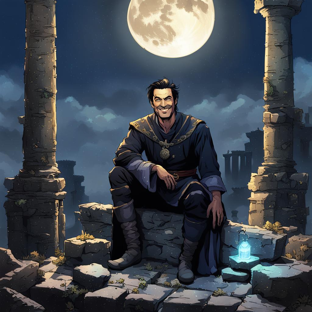 The sound of slow clapping came from behind them. Turning to find the source of the sound, they noticed a man dressed in merchant’s clothes sitting casually upon some of the fallen stone ruins. The stranger wore a smile that seemed less than genuine and his eyes reflected the moonlight with a silver tinge. Tanthalas recognized this immediately from his past encounters… this was no man. Some dragon had decided to take on a form and seemed to be eyeing them all with amusement.
