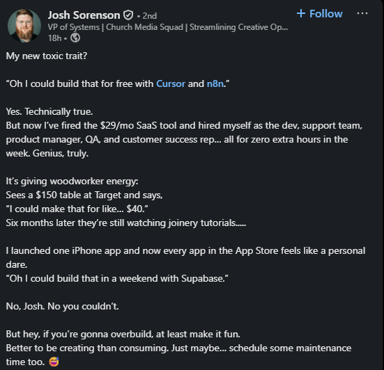The good side of this ease of building is that these new tools allow you to go and build something for yourself (if you want to) for fun. You won’t be saving money if you are trying to make it solid and great for others, but you might save yourself some dollars to get yourself a thing that is “good enough” for your usage. As the original LinkedIn poster, Josh Sorenson stated, “Better to be creating than consuming”. In a lot of senses, building software is just like a lot of maker hobbies. Along the way, you might even learn something! (Assuming you don’t just let AI build everything and you are actually looking at what it is doing and absorbing the why of it’s choices.)